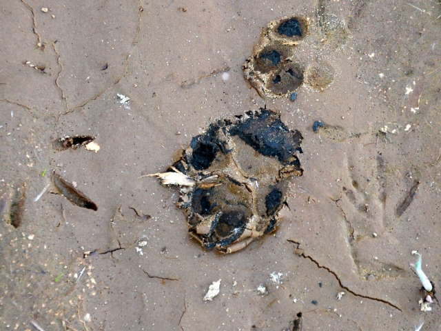 Rantahiekan päällä tassun- ja linnunjäljet ja alla jotain mustaa.